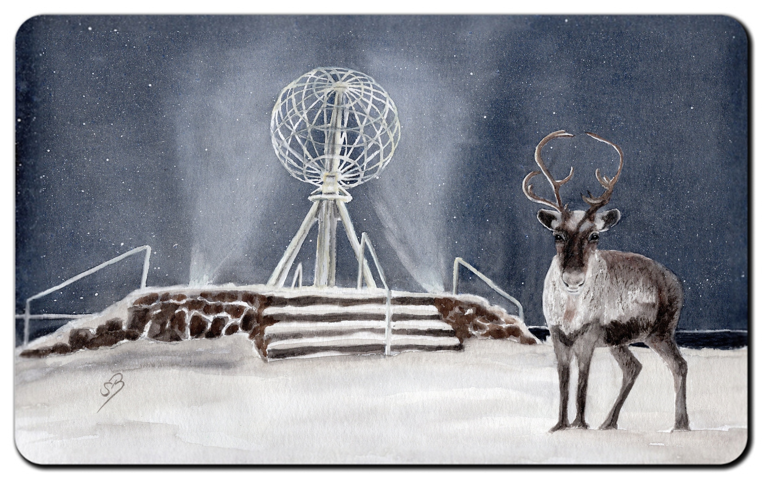 Frühstücksbrettchen Brettchen Aquarell Kunst Druck Kunstdruck Norwegen Norge Norway  Nordkapp Nordkap Globus Winter Rentier