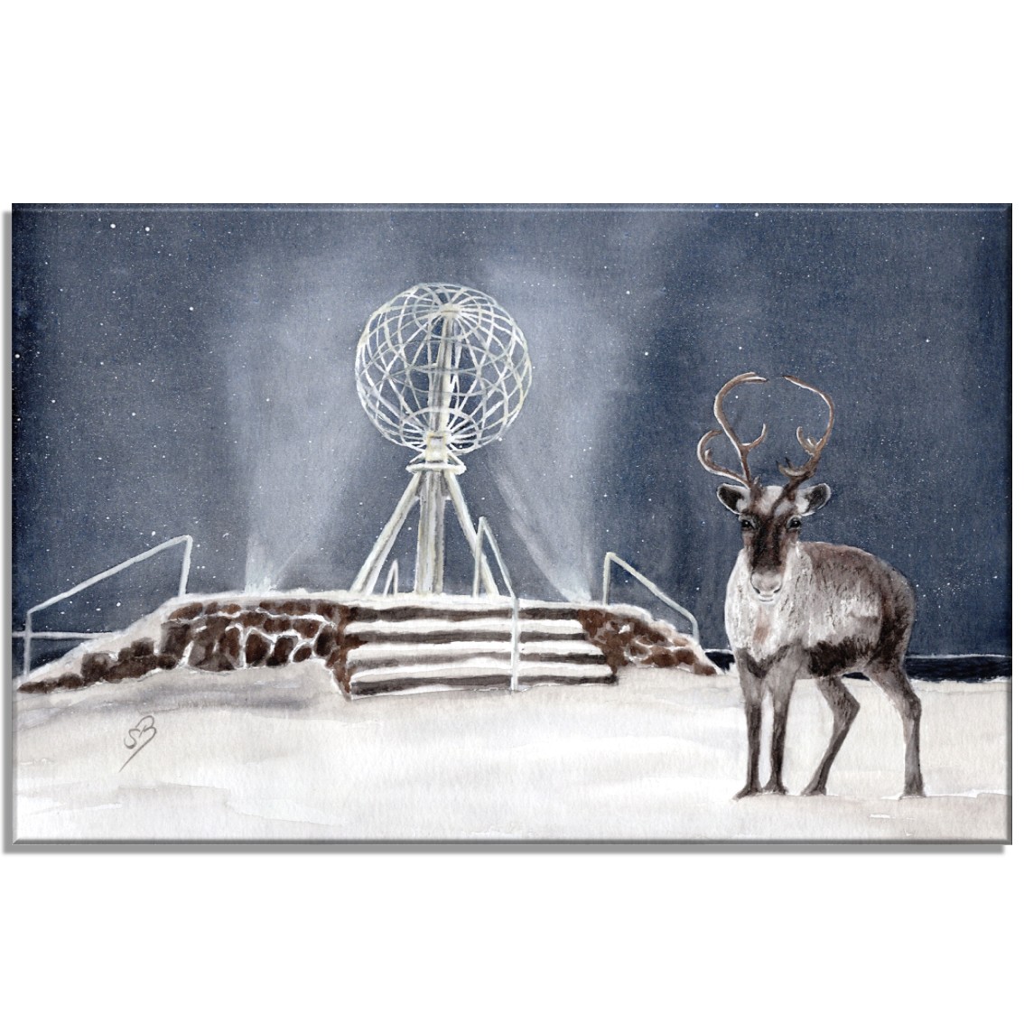 Leinwand 40 x 30 cm Keilrahmen Canvas-Leinen Aquarell Kunst Druck Kunstdruck Norwegen Norge Norway  Nordkapp Nordkap Globus Winter Rentier
