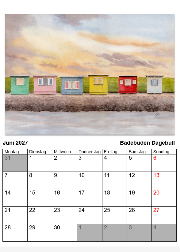 Kalender Nordsee Aquarell 2027 Borkum Helgoland Langeoog Westerhever Juist Dagebüll Neuharlingersiel.