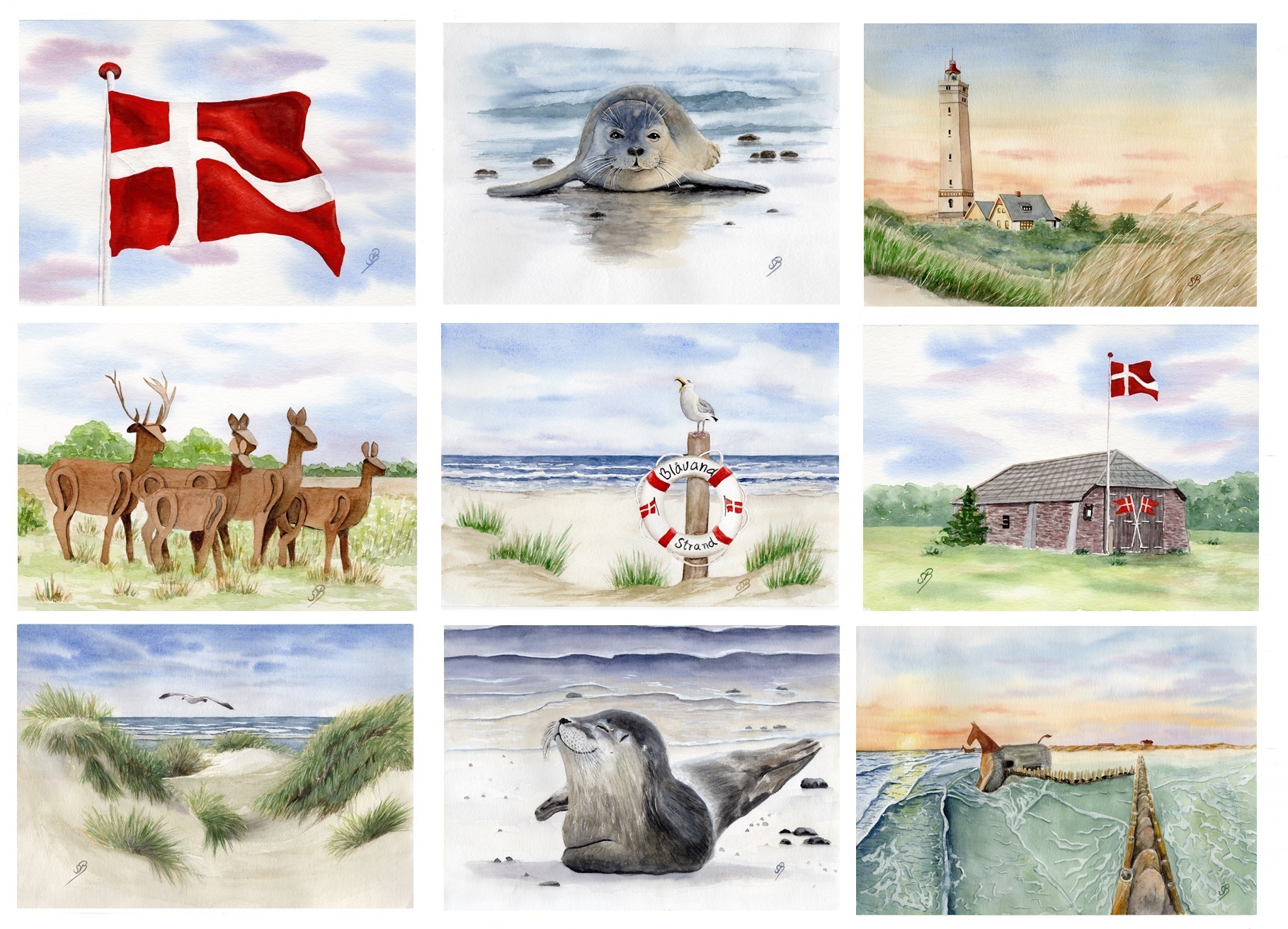 Poster DIN-A3  Aquarell Maritim Kunst Druck Kunstdruck Nordsee Dänemark Danmark Blåvand Blavand Dünen Leuchtturm Strand Seehund Maultiere