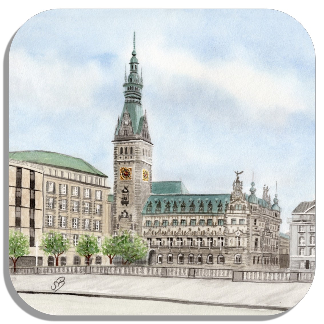 Untersetzer Glasuntersetzer 9,5 x 9,5 cm Aquarell Maritim Kunst Druck Kunstdruck Hamburg Rathaus - HH14