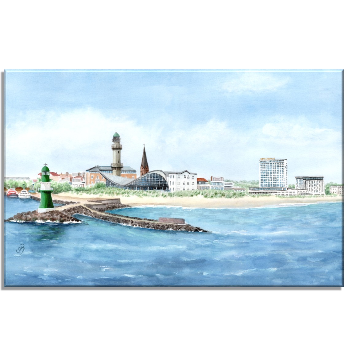 Mobile Preview: Stretcher frame canvas 40 x 30 cm Watercolor Maritime Art Print Baltic Sea lighthouse Warnemünde - Panorama - WA15